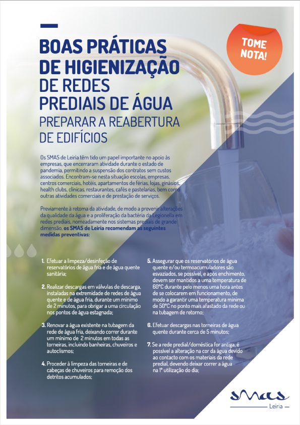 - Se a água da torneira tiver uma cor branca, normalmente devido à existência de ar dissolvido na água, deixe repousar a água por alguns minutos antes de a consumir. Caso a situação persista, contacte os SMAS de Leiria;